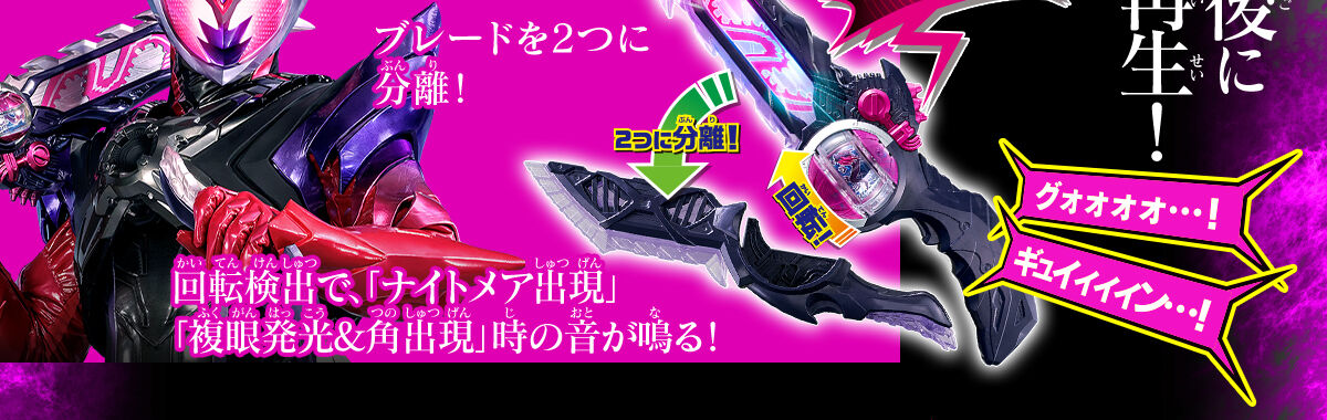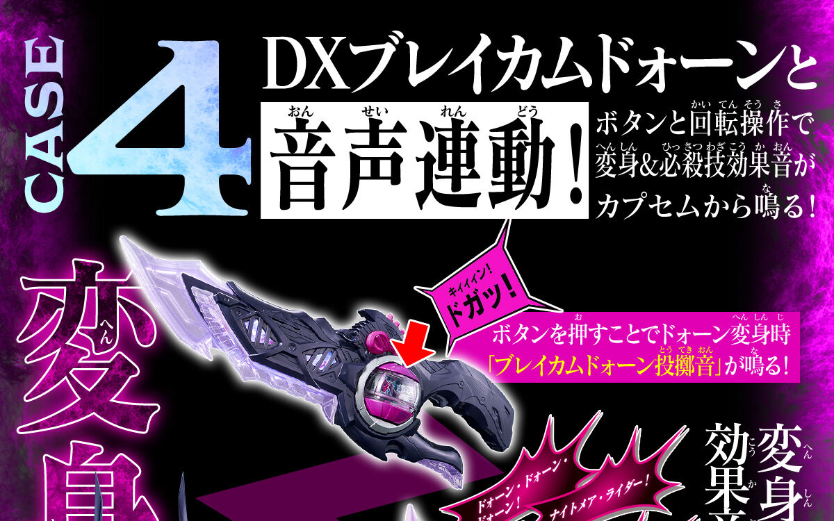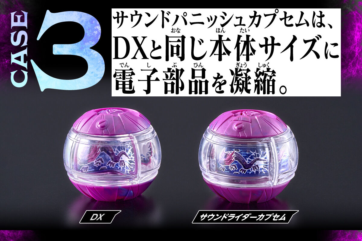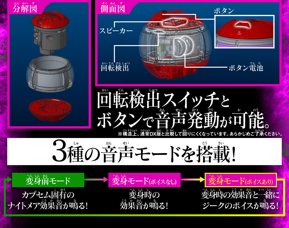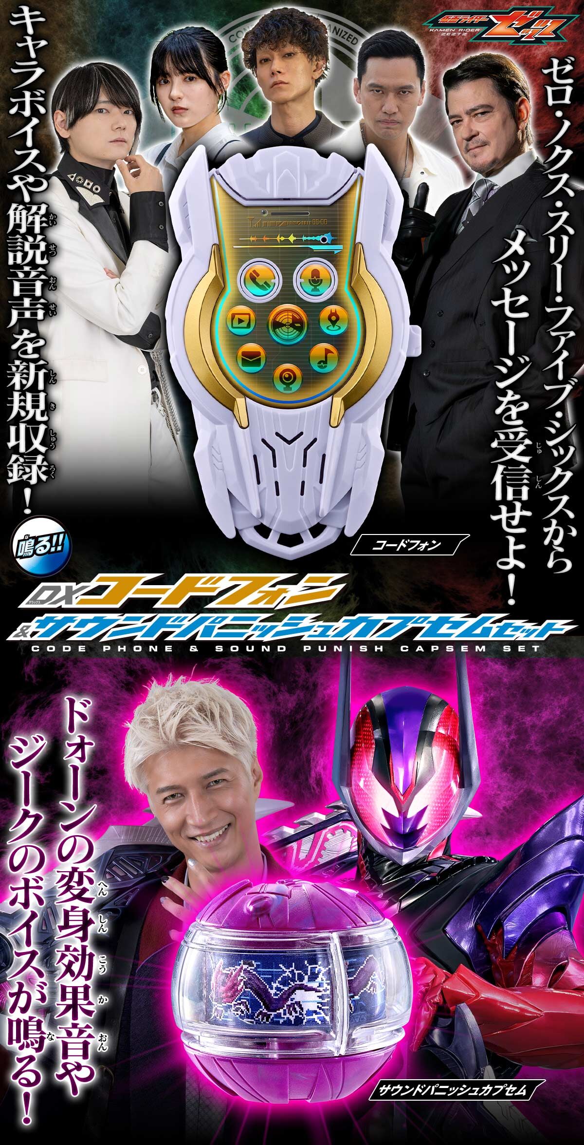 『仮面ライダーゼッツ』に登場するスマホアイテムDXコードフォンは、ゼロ、ノクス、スリー、ファイブ、シックスといったエージェントたちからのメッセージを受信可能。 キャラクターボイスは35種以上を搭載しています。さらに、ライダーカプセムシリーズの解説音声は全種新録!DXゼッツフォンとは異なる、新しい解説音声を楽しめます。また、ゼッツフォン同様に録音機能を備え、録音した音声をボイスチェンジして再生する遊びも可能です。 サウンドパニッシュカプセムは、DX版と同一の本体サイズに電子部品を搭載。カプセム特有の回転検出スイッチとボタン操作により音声が発動します。音声モードは切り替えが可能で、カプセム固有の効果音が発動可能な「変身前モード」、変身時の効果音が発動可能な「変身モード(ボイスなし)」、変身時の効果音に合わせてジーク(演:天野浩成)のボイスが鳴る「変身モード(ボイスあり)」の3種が搭載されています。 さらに、別売りのDXブレイカムドォーンと音声連動し、カプセムをセットして回転させることで、ブレイカムドォーンから鳴る変身音に合わせてカプセムから追加効果音が発動します。変身後、カプセムを回転させることで異なる効果音も再生可能。さらに必殺技操作時も追加効果音を発動させることができます。 また、本商品にはジークのキャラクターボイスを収録。計6音が収録されており、変身時のボイスなど劇中の印象的な台詞と共になりきり遊びが楽しめます。