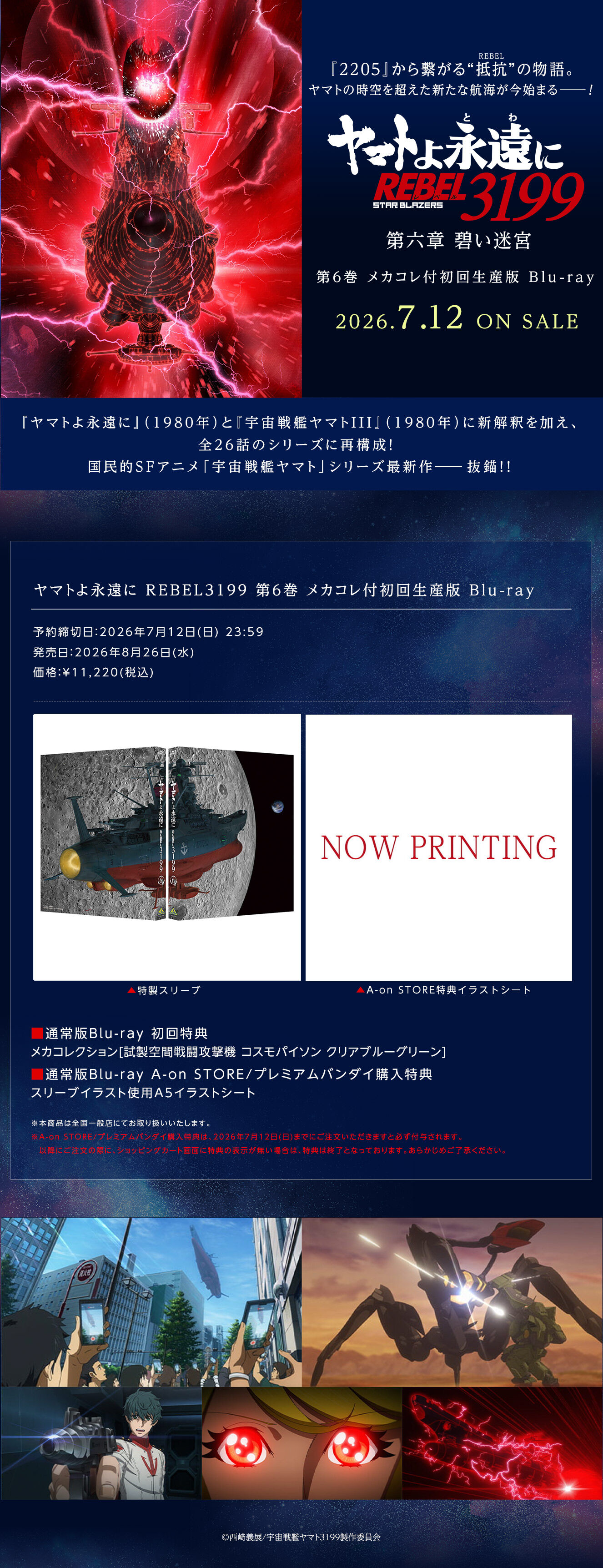 【Aon STORE/プレミアムバンダイ購入特典】 ■スリーブイラスト使用A5イラストシート ※A-on STORE/プレミアムバンダイ購入特典は、2026年7月12日(日)までにご注文いただきますと必ず付与されます。それ以降にご注文の場合は特典は無くなり次第終了となります。 ----------------------------------------------- ◎『2205』から繋がる“抵抗”の物語。ヤマトの時空を超えた新たな航海が今始まる――!! ◎『ヤマトよ永遠に』(1980年)と『宇宙戦艦ヤマトIII』(1980年)に新解釈を加え、全26話のシリーズに再構成!studio MOTHERが手掛ける国民的SFアニメ「宇宙戦艦ヤマト」シリーズ最新作――抜錨!! 五十年目の“抵抗” !お買い求めの前に、必ずお読みください! ※商品画像はイメージです。実際の商品と異なる場合がございます。 ※本商品はプレミアムバンダイ販売分の準備数に限りがございます。 準備数に達した場合、早期にご注文の受付を終了させていただくことがございます。 ※ご要望多数の場合、お届け時期を変更し、再度受注を行うことがございます。 ※注文期間は予告なく変更となる場合があります。 ※本商品は他の商品との買い合わせはできません。 ※撮影環境やご利用のモニター環境により、実物と多少異なって見える場合がございます。