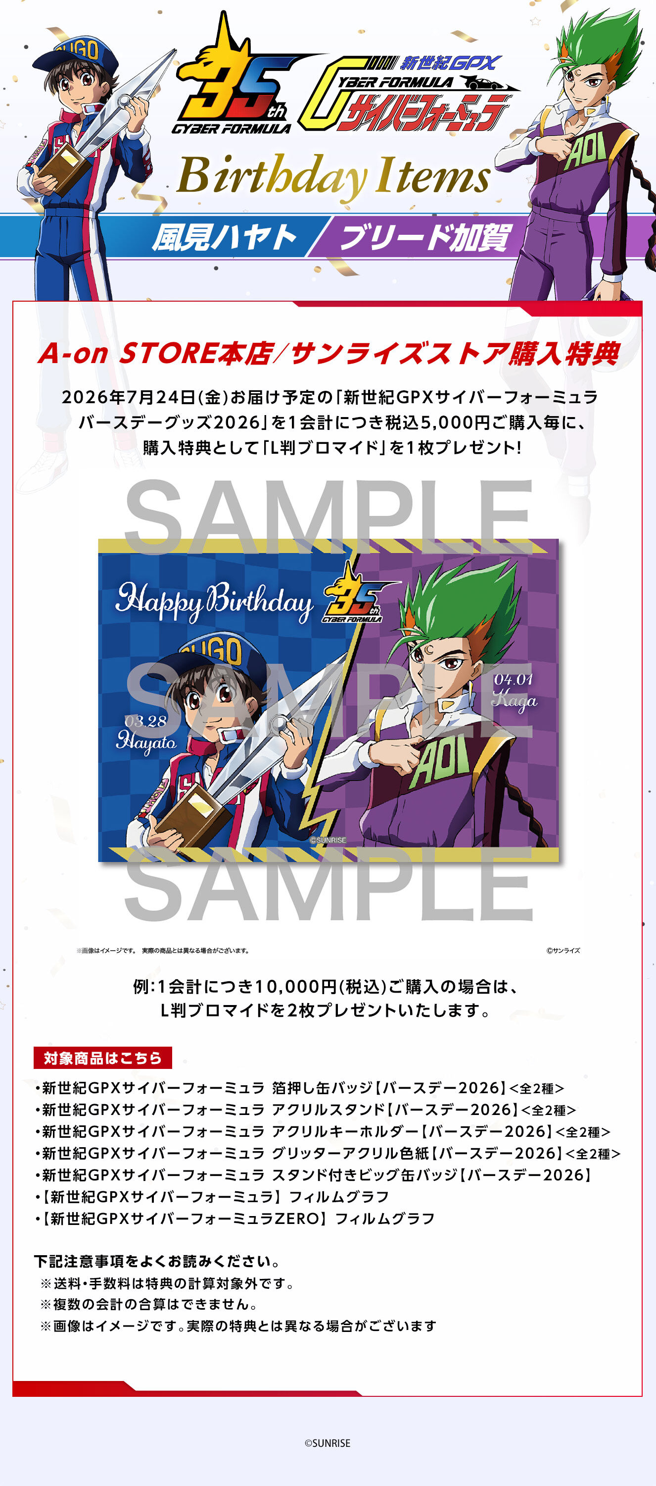 ※商品画像はイメージです。実際の商品と異なる場合がございます。※注文期間は予告なく変更となる場合があります。 ※本商品はプレミアムバンダイ販売分の準備数に限りがございます。 準備数に達した場合、早期にご注文の受付を終了させていただくことがございます。 ※ご要望多数の場合、お届け時期を変更し、再度受注を行うことがございます。その際に条件を変えて販売する可能性がございます。 ※本商品は、同日発売の『新世紀GPXサイバーフォーミュラ バースデーグッズ』とのみ買い合わせが可能です。