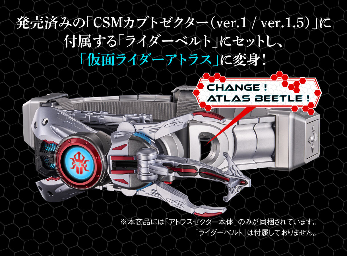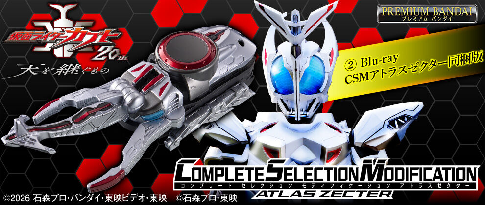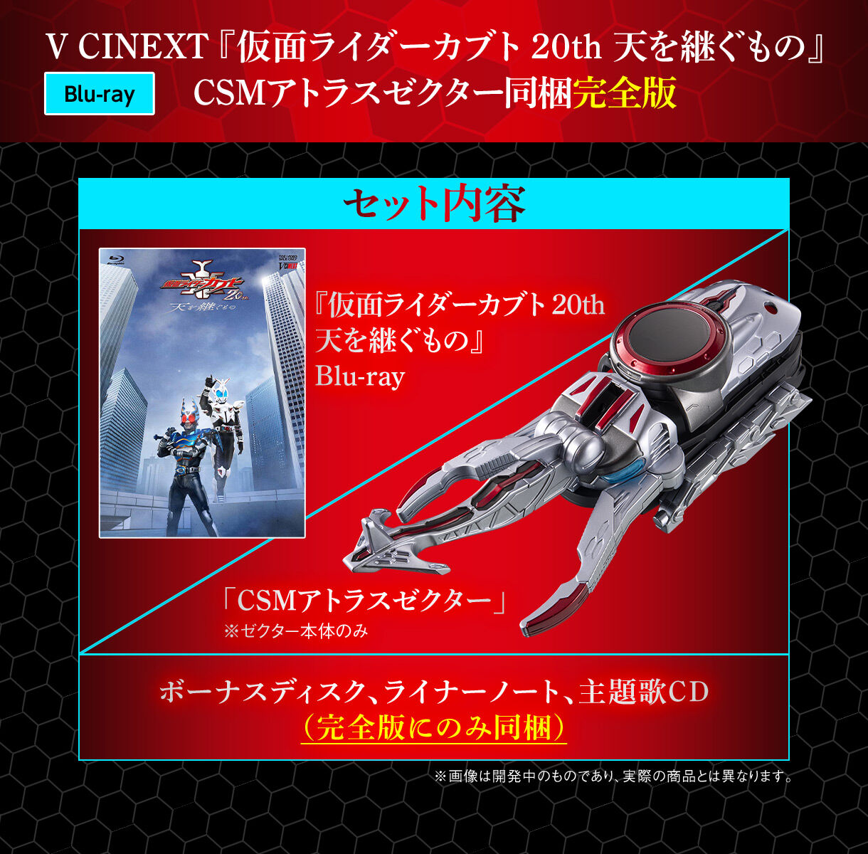 商品説明 2026年期間限定上映予定Vシネクスト『仮面ライダーカブト20th 天を継ぐもの』のBlu-ray完全版と劇中に登場する「アトラスゼクター」がセットになったスペシャル版(初回生産限定)を発売します。 CSMアトラスゼクターは、発売済みの「CSMカブトゼクター(ver.1/ver.1.5)」に付属する「ライダーベルト」にセットすることで、「仮面ライダーアトラス」の変身遊びが可能です。 一般店頭発売 2027年6月9日(水) 特典(予定) 映像特典:予告、ポスターギャラリー 音声特典:オーディオコメンタリー ボーナスディスク:メイキング、各種舞台挨拶 ライナーノート 主題歌CD セット内容 Vシネクスト『仮面ライダーカブト20th 天を継ぐもの』(Blu-ray完全版)…1 CSMアトラスゼクター…1 商品サイズ CSMアトラスゼクター…H約120o×W約115o×D約120o 対象年齢 15才以上 電池 単4電池×3(別売り) 備考 お買い求めの前に:必ずお読みください。