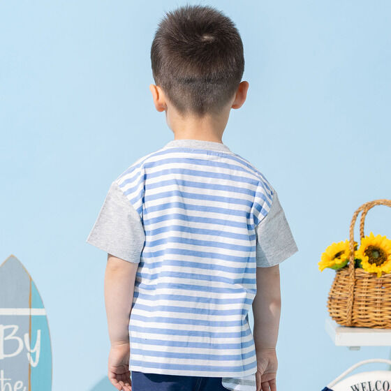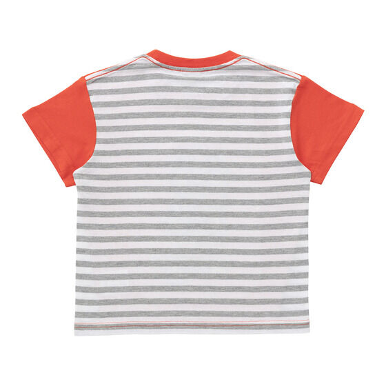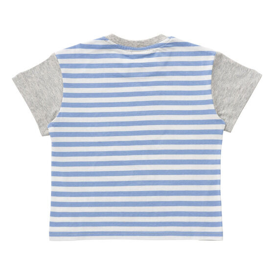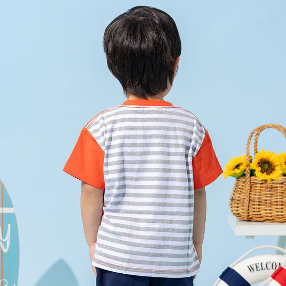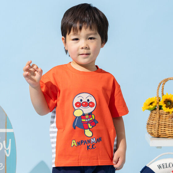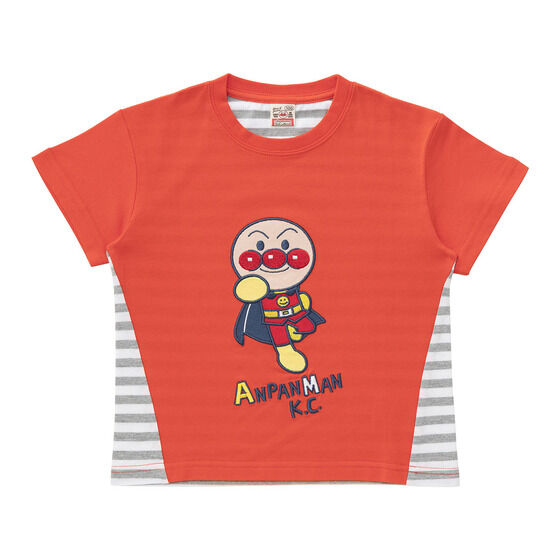 大きなアップリケが目を引く切替Tシャツ! オレンジ配色はアンパンマン、杢グレー配色にはだだんだんが全身で大きくアップリケされています。 フロントからバックにかけて斜めにボーダー切替されており、配色もおしゃれな1枚です。