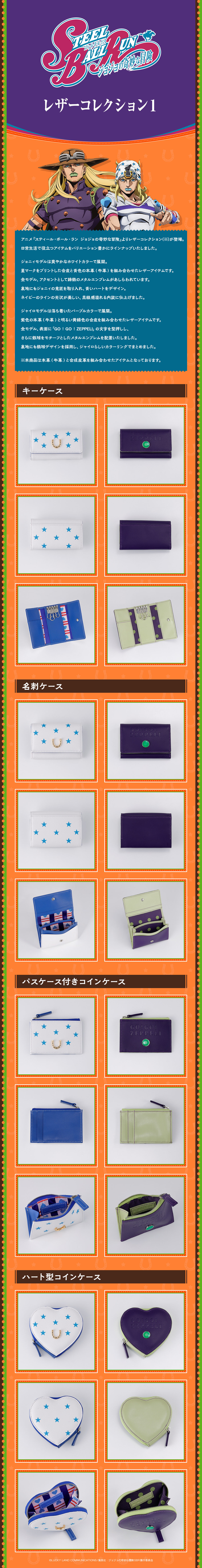 アニメ『スティール・ボール・ラン ジョジョの奇妙な冒険』よりレザーコレクション(※)が登場。 日常生活で役立つアイテムをバリエーション豊かにラインナップいたしました。