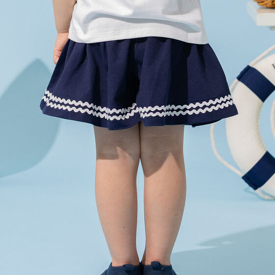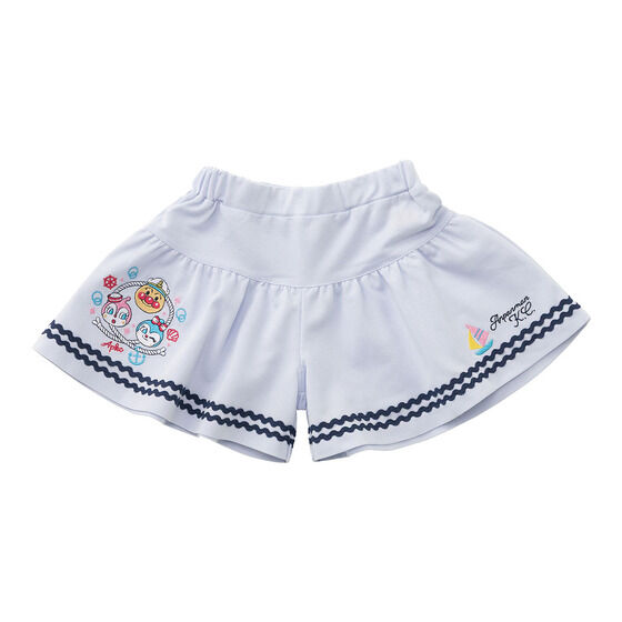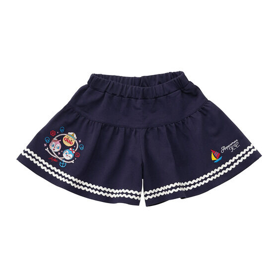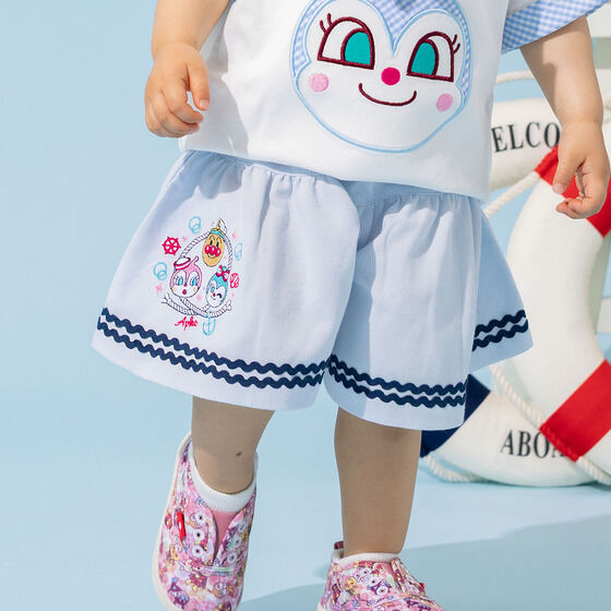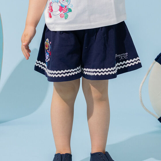 マリン帽を被ったなかまたちがかわいいマリンキュロット。 裾にはアンパンマン、ドキンちゃん、コキンちゃんの刺繍入り♪ 後ろまでタックプリーツが入った、後ろ姿もぬかりなく可愛いシルエット! ウエストはゴム仕様で脱ぎ履きしやすいのもポイント。 ウエストのマリン釦はトップスをインしたときも可愛さを演出します。 インナーパンツを備えており、動き回っても安心です。