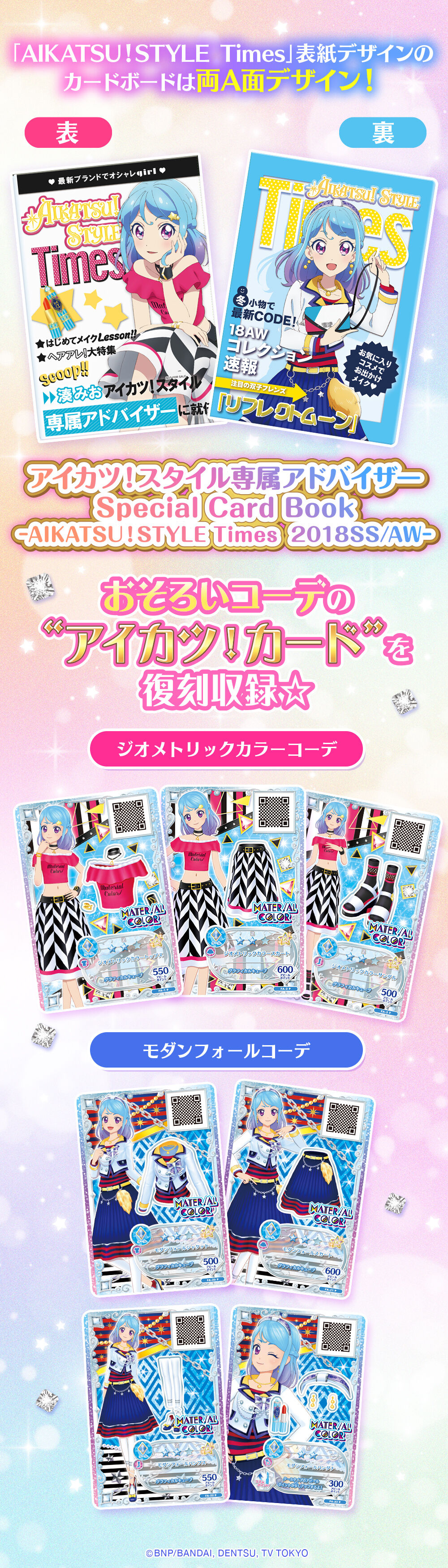 〜アイカツ!デザインマートPREMIUMグッズ〜 ARY! 「アイカツ!スタイル」専属アドバイザーとおそろいコーデのアイカツ!カードを復刻★ TVアニメ「アイカツフレンズ!」放送当時、カタログとして配布していた「AIKATSU!STYLE Times」の表紙風デザインのカードボードにセットしてお届け♪ 両A面デザインです! ※アイカツ!オフィシャルストアに設置のアイカツ!マシンで読み取り可能なアイカツ!カードです♪ ※データカードダス「アイカツオンパレード!」でプレイする際、カードの記載内容に対応していない部分がございます。 2018SS/AW ver.には、アイカツ!カードを7枚収録♪ 湊 みおちゃん着用 :ジオメトリックカラーコーデ(FA-1 P/FA-2 P/FA-3 P)/ モダンフォールコーデ(FA-20 P/FA-21 P/FA-24 P) 【セット内容】 カード:7枚 カードボード:1枚 【製品素材】 カードボード:PPコート紙 カード:紙 【対象年齢】 15歳以上 【カードボードサイズ】 閉じた状態:約H202mm×W146mm 【注記】 ※こちらの商品に収録するアイカツ!カードは、放送当時、店舗購入特典として配布していたカードを復刻したものです。 ※商品仕様は予告なく変更になる場合があります。 ※掲載しているデザイン、商品画像は開発中のもののため、実際の商品とは異なる場合がございます。 ※商品仕様や発送日は予告なく変更になる場合がございます。予めご了承ください。 ※準備数に達し次第、ご注文の受付を終了致します。多数のご要望をいただいた場合、準備数を調整して再度販売することがございます。予めご了承ください。 ※海外の一部地域で販売する場合がございます。 |