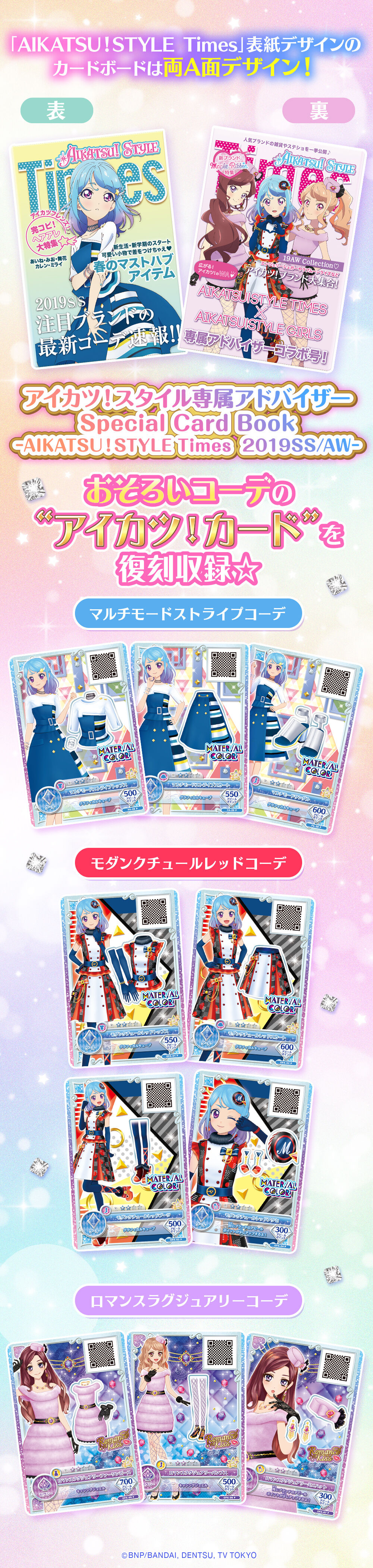 アイカツスターズ!10th ANNIVERSARY 〜アイカツ!デザインマートPREMIUMグッズ〜 ARY! 「アイカツ!スタイル」専属アドバイザーとおそろいコーデのアイカツ!カードを復刻★ TVアニメ「アイカツフレンズ!」「アイカツオンパレード!」放送当時、カタログとして配布していた「AIKATSU!STYLE Times」の表紙風デザインのカードボードにセットしてお届け♪ 両A面デザインです! ※アイカツ!オフィシャルストアに設置のアイカツ!マシンで読み取り可能なアイカツ!カードです♪ ※データカードダス「アイカツオンパレード!」でプレイする際、カードの記載内容に対応していない部分がございます。 2019SS/AW ver.には、アイカツ!カードを10枚収録♪ 湊 みおちゃん着用 :マルチモードストライプコーデ(FA-28 P/FA-29 P/FA-30 P)/ モダンチュールレッドコーデ(OPA-01 P/OPA-02 P/OPA-03 P/OPA-04 P) 香澄夜空ちゃん・真昼ちゃん着用 :ロマンスラグジュアリーコーデ(OPA-05 P/OPA-07 P/OPA-07 P) 【セット内容】 カード:10枚 カードボード:1枚 【製品素材】 カードボード:PPコート紙 カード:紙 【対象年齢】 15歳以上 【カードボードサイズ】 閉じた状態:約H202mm×W146mm ※全4種内、こちらのカードボードのみ3つ折り仕様です。開いた状態約W444mm 【注記】 ※こちらの商品に収録するアイカツ!カードは、放送当時、店舗購入特典として配布していたカードを復刻したものです。 ※商品仕様は予告なく変更になる場合があります。 ※掲載しているデザイン、商品画像は開発中のもののため、実際の商品とは異なる場合がございます。 ※商品仕様や発送日は予告なく変更になる場合がございます。予めご了承ください。 ※準備数に達し次第、ご注文の受付を終了致します。多数のご要望をいただいた場合、準備数を調整して再度販売することがございます。予めご了承ください。 ※海外の一部地域で販売する場合がございます。 |