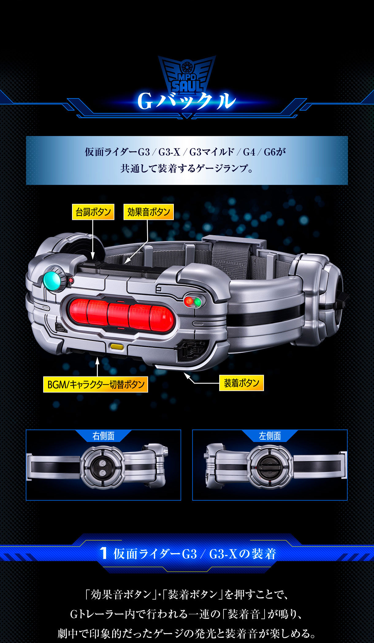 バックル商品にはLEDを多数内臓し、劇中で行われるG3の装着シーンの発光を再現しています。「装着ボタン」、「効果音ボタン」、「台詞ボタン」、「BGMボタン」を搭載し、劇中の様々な装着・戦闘演出や、ダメージ演出を楽しむことが可能です。