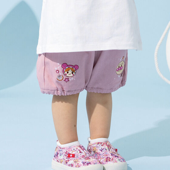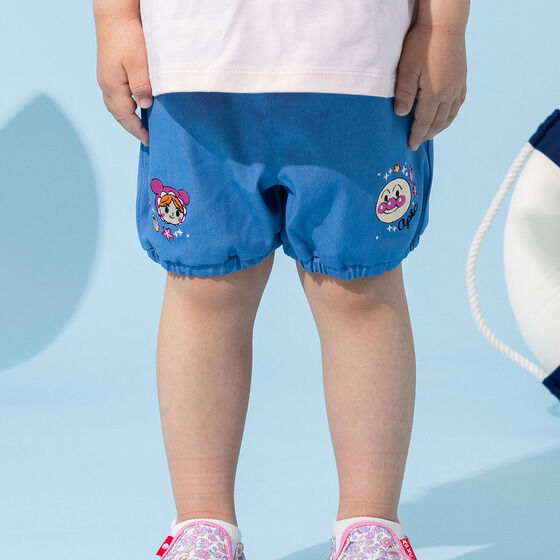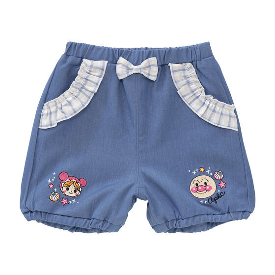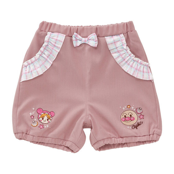 ふんわりシルエットが可愛いかぼちゃパンツ! 左裾にはアンパンマン、右裾にはあかちゃんまんのお顔が刺繍されています。 ポケット口にはチェック柄のフリル、センターにはリボンがついた細部までこだわったデザインです。 裏地がないので夏でもさらっと快適に着用いただけます。