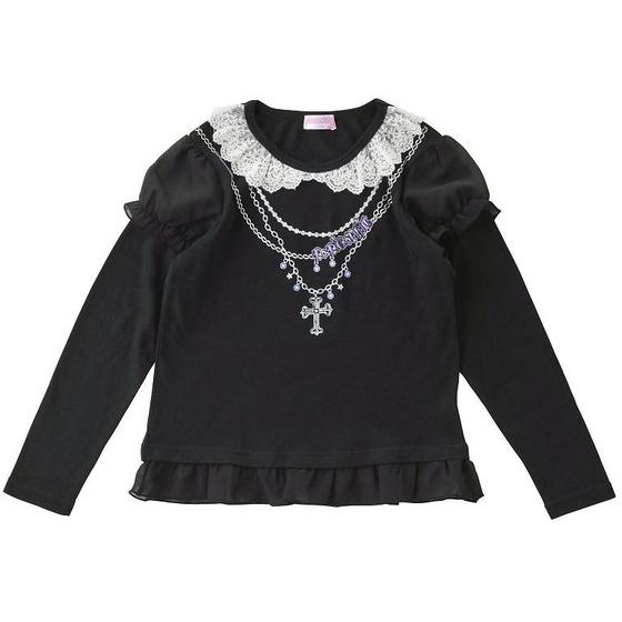 パフスリーブの半袖と長袖Tシャツのレイヤード風デザイン。レースの衿とトロンプルイユのペンダントがポイントです。