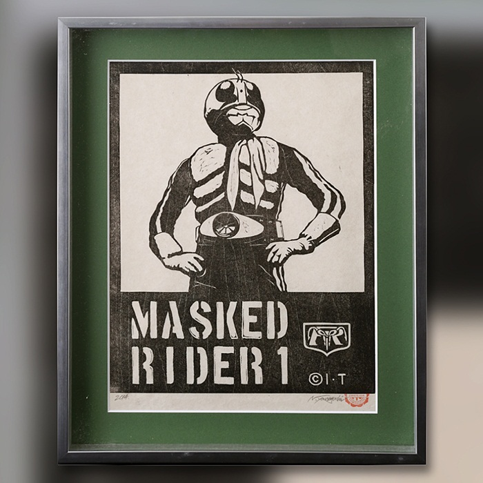 木版画家ヤマグチノリカズ氏が初代仮面ライダーへのオマージュとして本商品を作成。