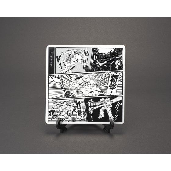 また、ザクの数々ある激闘の勇姿を描いたオリジナルイラストの漫画皿「ザクやられ皿(約175mm×約175mm)」と