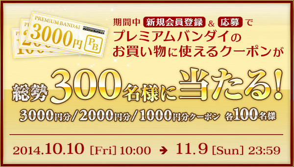 キャンペーン期間中にプレミアムバンダイ会員登録後、2014年11月9日(日)23:59までにお申し込みいただいた方がキャンペーンの対象となります。