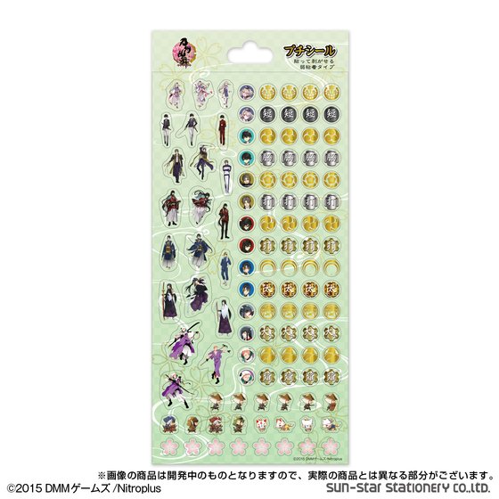 シール1枚には、7振の刀剣男士それぞれの「立ち姿」「抜刀姿」「内番姿」のシールと紋シールなど113ピースが揃っています。