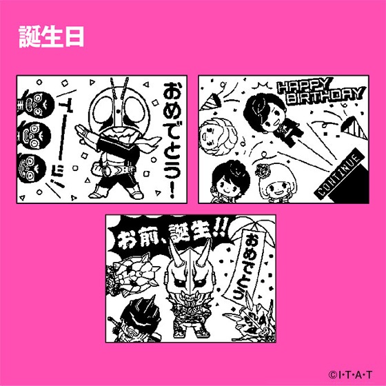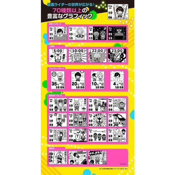 「くつろぐ九条貴利矢」といったグラフィックを70種類以上ご用意。祝日や記念日には歴代仮面ライダーのオリジナルイラストを表示し、