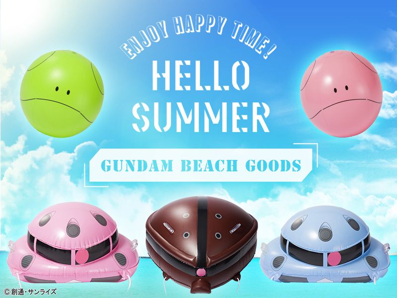 水陸両用モビルスーツ「ズゴック」「アッガイ」と、マスコットロボ「ハロ」をイメージした浮輪やボールなどのビーチグッズ3種