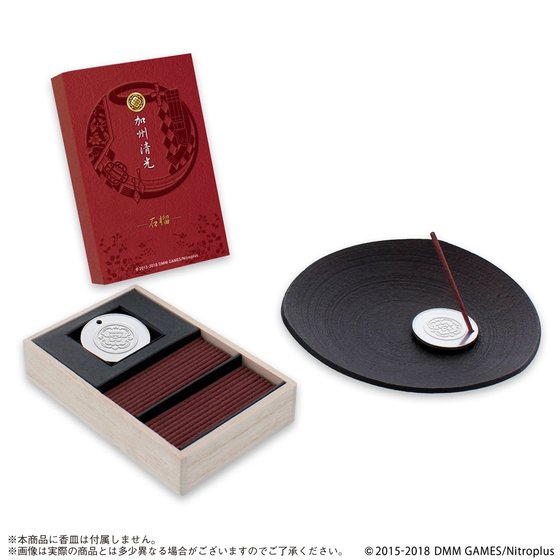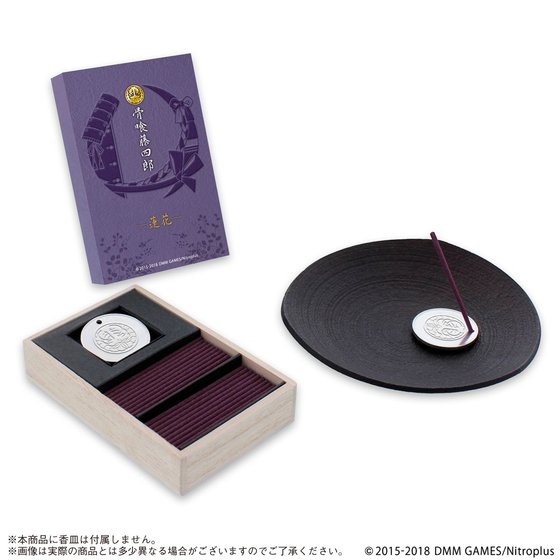 また各刀剣男士の紋をデザインした錫製のお香立てが付属しており、本商品を焚き染めることで、刀剣男士をイメージしながら