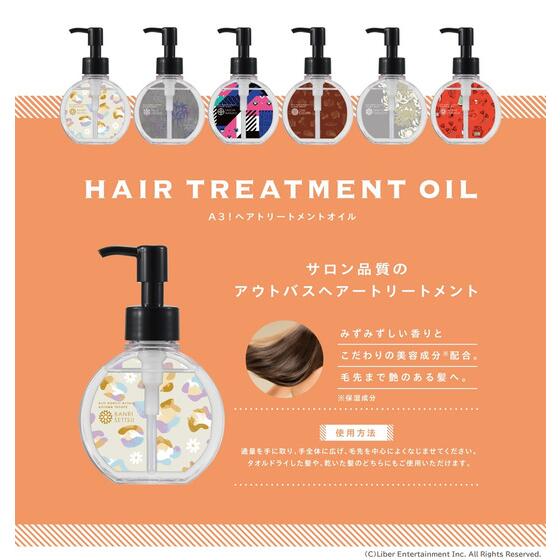 本商品は、『A3!』に登場する秋組の劇団員6人をイメージした『ヘアトリートメントオイル』全6種です。