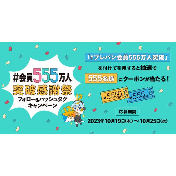 キャンペーン対象の投稿を「#プレバン会員555万人突破」を付けて引用していただいた方の中から、抽選で555名様にクーポンプレゼント。
