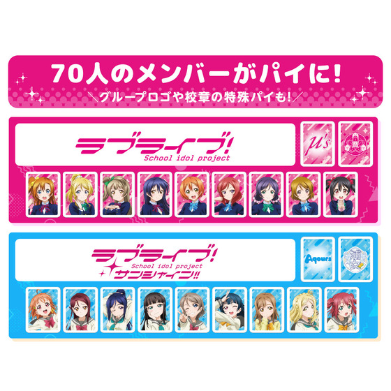 セット内容は、『ラブライブ!シリーズ』に登場する70人のメンバーのパイを収録。特殊パイとしてグループロゴや校章のパイも入っています。